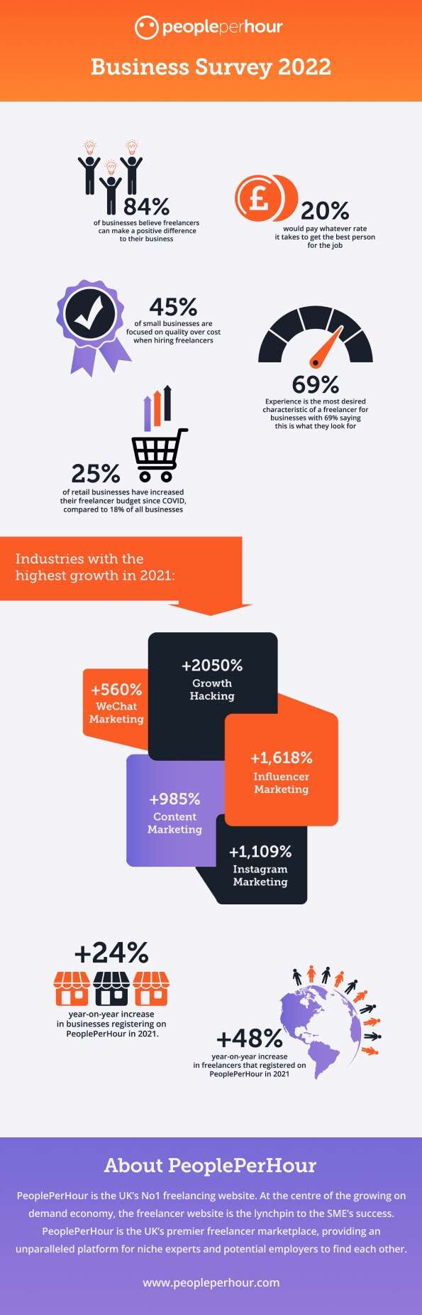 About the survey: PeoplePerHour surveyed 450 businesses in January 2022. Additional data comes from PeoplePerHour’s registered buyer and freelancer statistics unless otherwise stated. Stats can be viewed here: https://www.peopleperhour.com/discover/news/business-survey-2022-infographic/