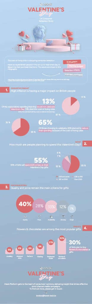 Hawk’s customised survey tool illustrates value of pre-planning campaign insights and research studies 13% of Brits will not celebrate Valentine’s Day this year on account of the cost-of-living crisis while, of those people marking the occasion, 65% plan to reduce their spending.