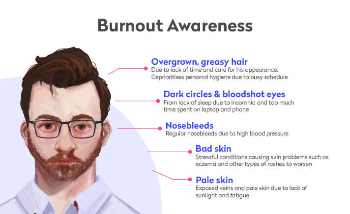 - Meet Steve, the burned-out entrepreneur of the future, suffering the side effects of burnout such as arthritis & repetitive strain, headaches, hunchback, bloating, bad skin and bloodshot eyes.