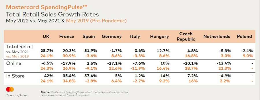 Wednesday 8 June 2022, London: Measuring in-store and online sales across all forms of payments, new data from Mastercard SpendingPulseTM shows the UK, along with Spain and France, led year-over-year spending growth in May among the countries measured, not adjusted for inflation.