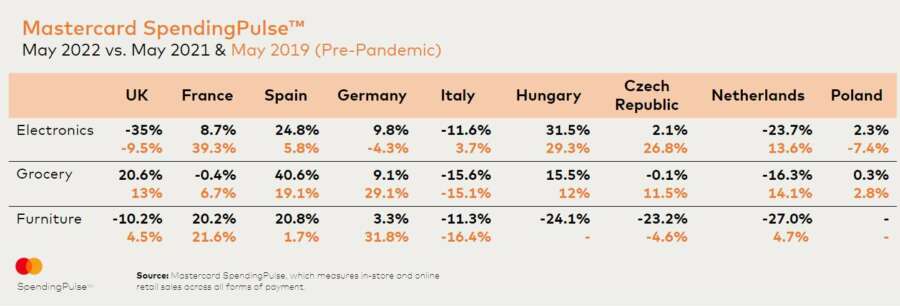 According to Mastercard SpendingPulse, key trends for May across Europe show the diversification of spending across sectors and channels as pandemic restrictions ease:
