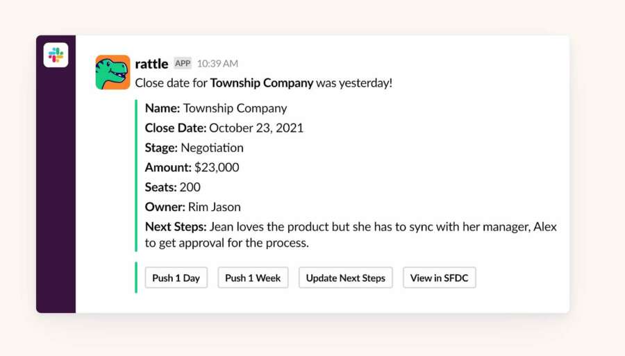As an example, Rattle can effortlessly be configured to notify Account Executives (AEs) before any upcoming prospect call on their calendar and let them update their CRM–actions like logging call notes, updating deal stages, next steps, etc–all from Slack or MS Teams. Before Rattle, updating the CRM meant juggling multiple tools but now it takes only a single click, saving each salesperson four hours every week.