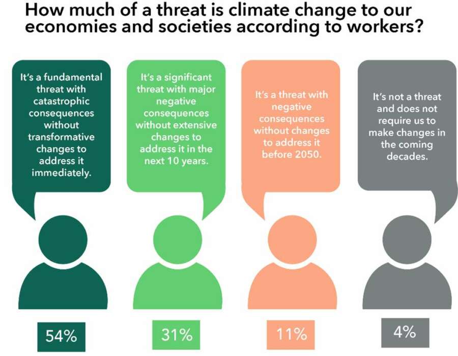 Employees want to see their employers taking stronger climate action – 57% of employees worldwide feel that it is important to their job satisfaction that their organisation is doing all that it can to reduce its contribution to climate change.