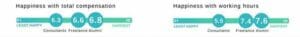 The study also showed that freelancers and consulting alumni are happier with their pay than consultants and are more satisfied with their working days of 43 hours a week and 50 hours a week, respectively, which drives their overall happiness.