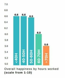 Overall happiness by hours worked is consistent until 60 hours worked per week, but anything above has a profound and negative influence.