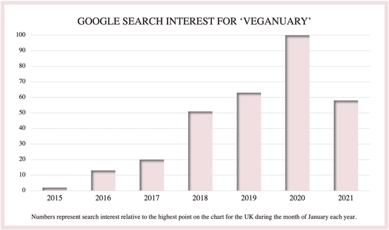 January is a big month in the vegan calendar, with many people taking on the challenge of eating animal-free meals for 31 days. The trend is becoming more popular, with Google searchesshowing interest rising year on year with only 2021 dipping just after its all-time high. Of course, 2021 was the first January within a lockdown. Perhaps the appeal for lifestyle changes dipped during this time.