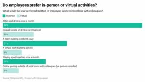 After a year of social isolation, and with many people clearly looking to form friendships at work, team-building efforts are more important than ever. The survey asked employees what their preferred method of team bonding would be.